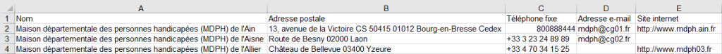 Fichier à télécharger avec les coordonnées officielles de toutes les MDPH (Maison départementale des personnes handicapées) en France avec nom, adresse postale, numéro de téléphone, adresse e-mail et site internet.